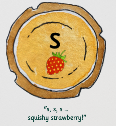 - Each sound is taught with an accompanying picture and action (e.g., “squishy squishy strawberry” for s)